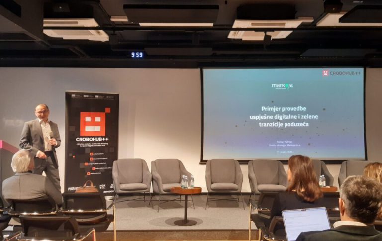 Na drugom javnom predstavljanju Europskog digitalnog inovacijskog centra (EDIH) CROBOHUB++, održanom 11. veljače 2025. na Sveučilištu Algebra, naš direktor strategije, Roman Rožman, predstavio je kako Markoja d.o.o. uspješno provodi digitalnu i zelenu tranziciju u svom poslovanju.